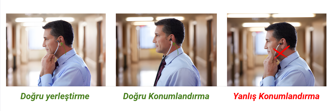 Öncelikle en yaygın hatalardan birisi stetoskobun kulak uçlarının kulağa ters takılmasıdır. İlk adım olarak stetoskobunuzu kulağınıza doğru taktığınızdan emin olun. Kulak uçları resimde gösterildiği gibi öne doğru bakacak şekilde takılmalıdır.