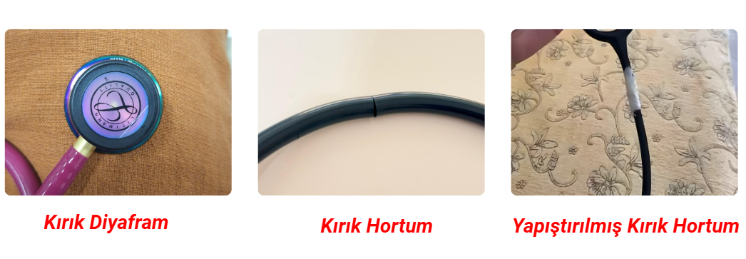 Üçüncü adım olarak da stetoskobunuzun hortumunda ya da diyafram parçasında yırtılma,çatlama var mı kontrol ediniz. Eğer bu parçalarda deforme varsa bu stetoskobunuzun akustik performansını etkileyecektir. Bazen hortum kısmı kırılan hekimlerimizin çözüm olarak kırılan yerden bantlayarak stetoskobunu kullanmaya devam ettiklerini gözlemlemekteyiz. Patlak bir lastikle araba kullanmaya devam etmek ne kadar tehlikeli bir durum ise hortumu çatlak bir stetoskopla hasta muayene etmek de o kadar riskli bir durumdur.
