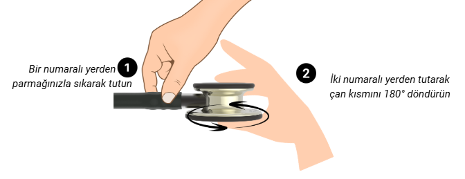 İkinci adım olarak Littmann Klasik 3 steteskop gibi birçok modelde hem yetişkin hem de pediatri taraftan aynı anda ses gelmez. Taraflar arasında geçiş yapabilmek için stetoskobunuzun çan kısmını 180° döndürmeniz gerekmektedir. Bu işlemi yapmak için bir elinizle stetoskobunuzun çandan hortuma geçerken hortumun en uç kısmından tutun ve diğer elinizle de çan kısmından tutarak stetoskobunuzun çan kısmını döndürün. Kilit sesini duyduktan sonrasında tekrar kontrol edebilirsiniz.